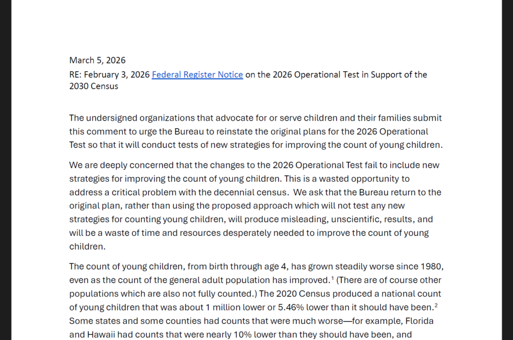 A number of child serving organizations submitted comments on the plan for the 2026 Census Test, which set forth how the test was originally expected to test new strategies for counting young children, and how the revised test omits all those new strategies. It asks the Bureau to conduct the tests as planned.